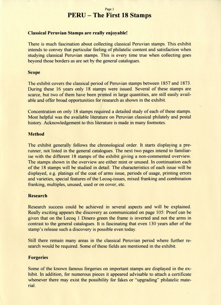 Es galt daher, das Exponat weiter fit zu machen und aufzurüsten, ehe mit dem Anmelden auf FIP-Niveau begonnen wurde. Die folgenden vier Jahre wurden hierfür benö-tigt. Günstig wirkte sich aus, daß der spanische Sammler Enrique Bustamente seine Peru-Sammlung auflöste und eine Reihe einzigartiger Stücke in das Exponat übernommen werden konnten.