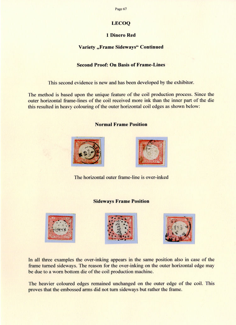 Die Sammlung entstand in fast zwei Jahrzehnten, ehe 1984 der Sprung ins kalte Wasser getan wurde und die Anmeldung zur „Americana“ in Siegburg erfolgte, einer Rang 3-Ausstellung. Dort hatte das Exponat das Glück, auf kenntnisreiche Juroren zu stoßen, vor allem Hans-Dieter Jaretzky. Das insgesamt nur 60 Blatt umfassende Exponat begann mit der Vorphilatelie und endete mit den Dreiecksaufdrucken, also den Provisorien, die nach Ende der chilenischen Besatzung herausgegeben wurden.